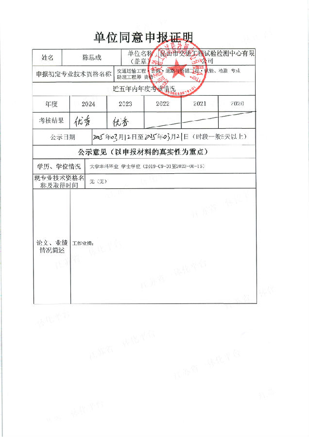 经过个人申请,职能机构审核,单位研究决定等工作程序,拟同意陈思成同志申报交通运输工程‧公路‧道路与桥隧工程‧试验、检测专业助理工程师。