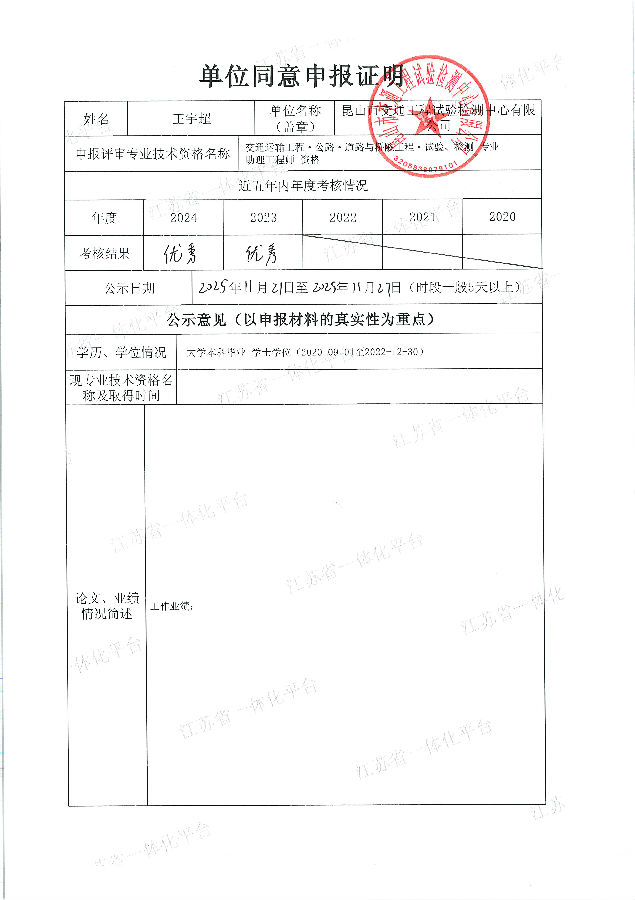 关于王宇超等同志申报交通运输工程‧公路‧道路与桥隧工程‧试验、检测专业助理工程师材料的公示